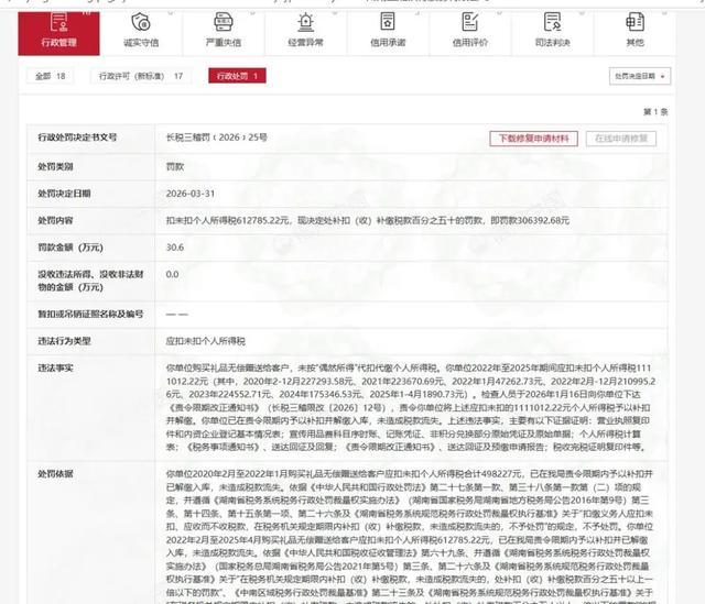 2026年3月31日,国家税务总局长沙市税务局第三稽查局向湖南三湘银行股份有限公司下达行政处罚决定:因“应扣未扣个人所得税”61.28万元,被处以补扣补缴税款50%的罚款,合计30.64万元。