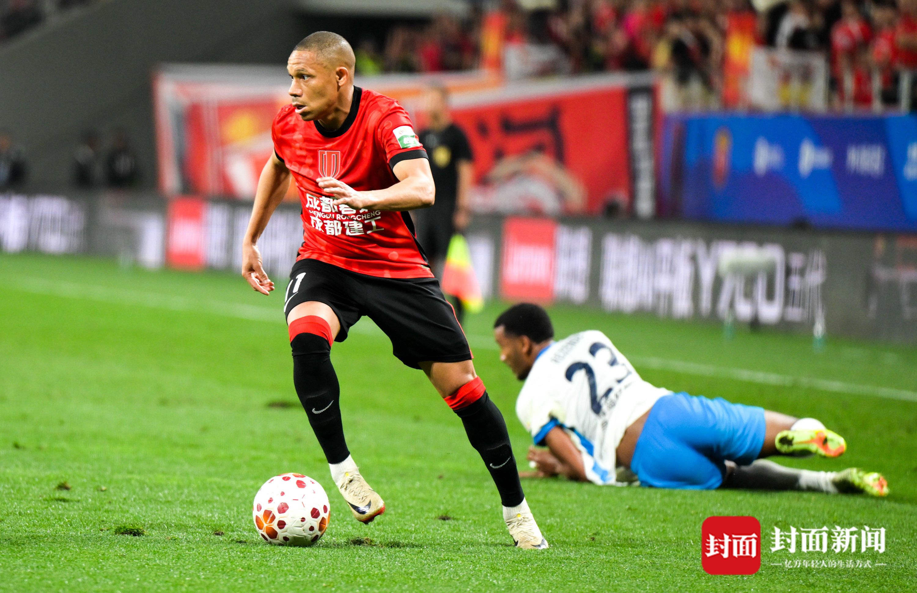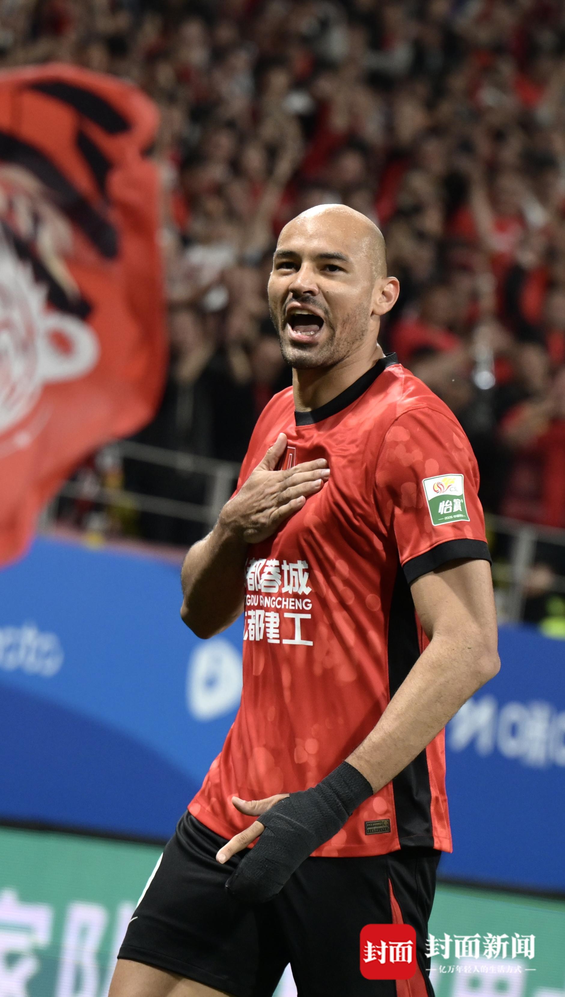 比赛补时阶段,成都蓉城在进攻时造成对方后卫手球,裁判经过视频助理裁判提示后,观看VAR回放,判罚了点球,费利佩主罚命中,将比分锁定在5-1!费利佩也就此上演帽子戏法,状态爆棚。今天恰好是费利佩的生日,全场球迷也唱起生日快乐歌为他送上祝福。